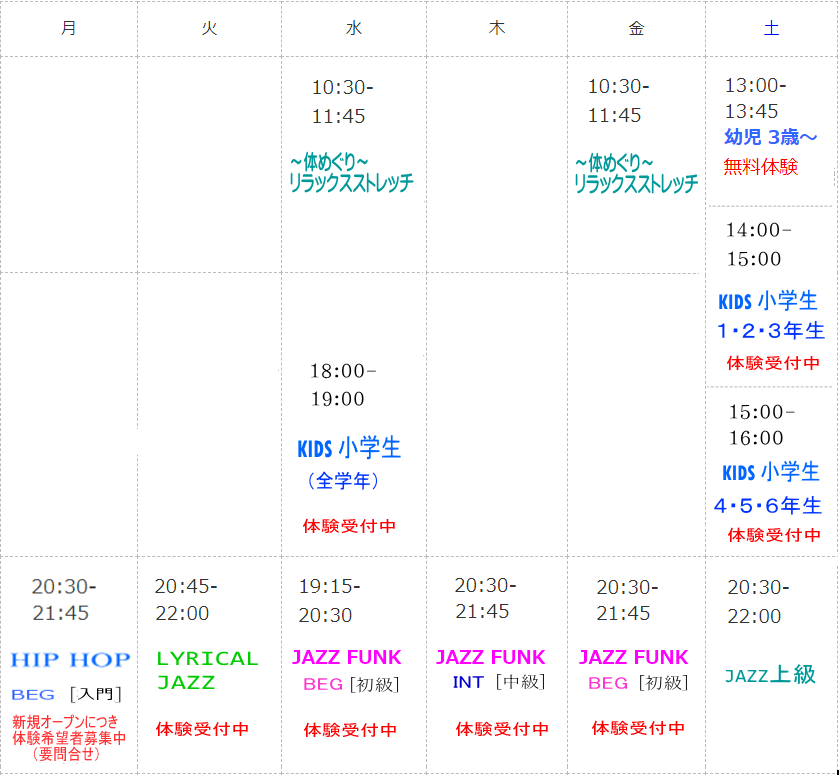 レッスンスケジュール ★「体験受付中」の文字があるクラスは体験レッスンが可能ですので是非お気軽にお越しください。 ★ 幼児クラスにつきましては体験レッスンは無料です。 FacebookXHatenaPocketCopy