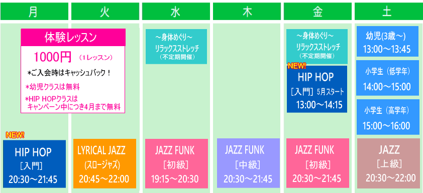 ★JAZZ FUNK 初級・中級クラスは現在発表会練習中につき体験は受け付けておりません。