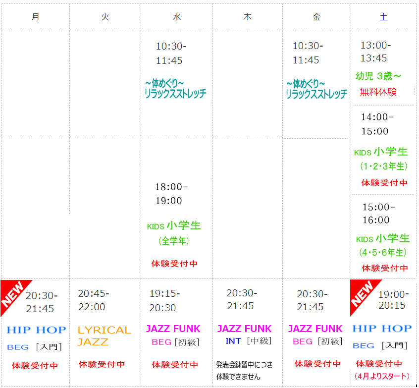 ★「体験受付中」の文字があるクラスは体験レッスンが可能ですので是非お気軽にお越しください。